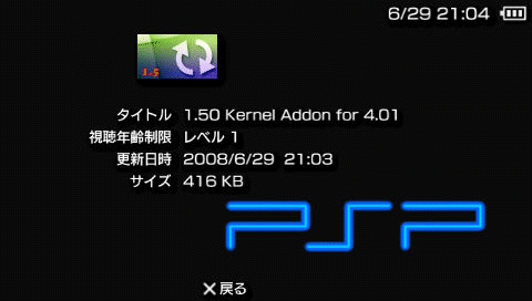 PSPを起動し、ゲーム→メモリースティックより1.50 Kernel Addon for 4.01を起動する。