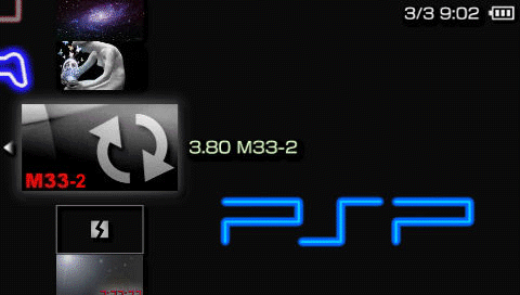 PSPを起動し、ゲーム→メモリースティックより3.80 M33-2を起動する。黒背景に白文字の画面になるので×を押してください。アップデートが開始されます。